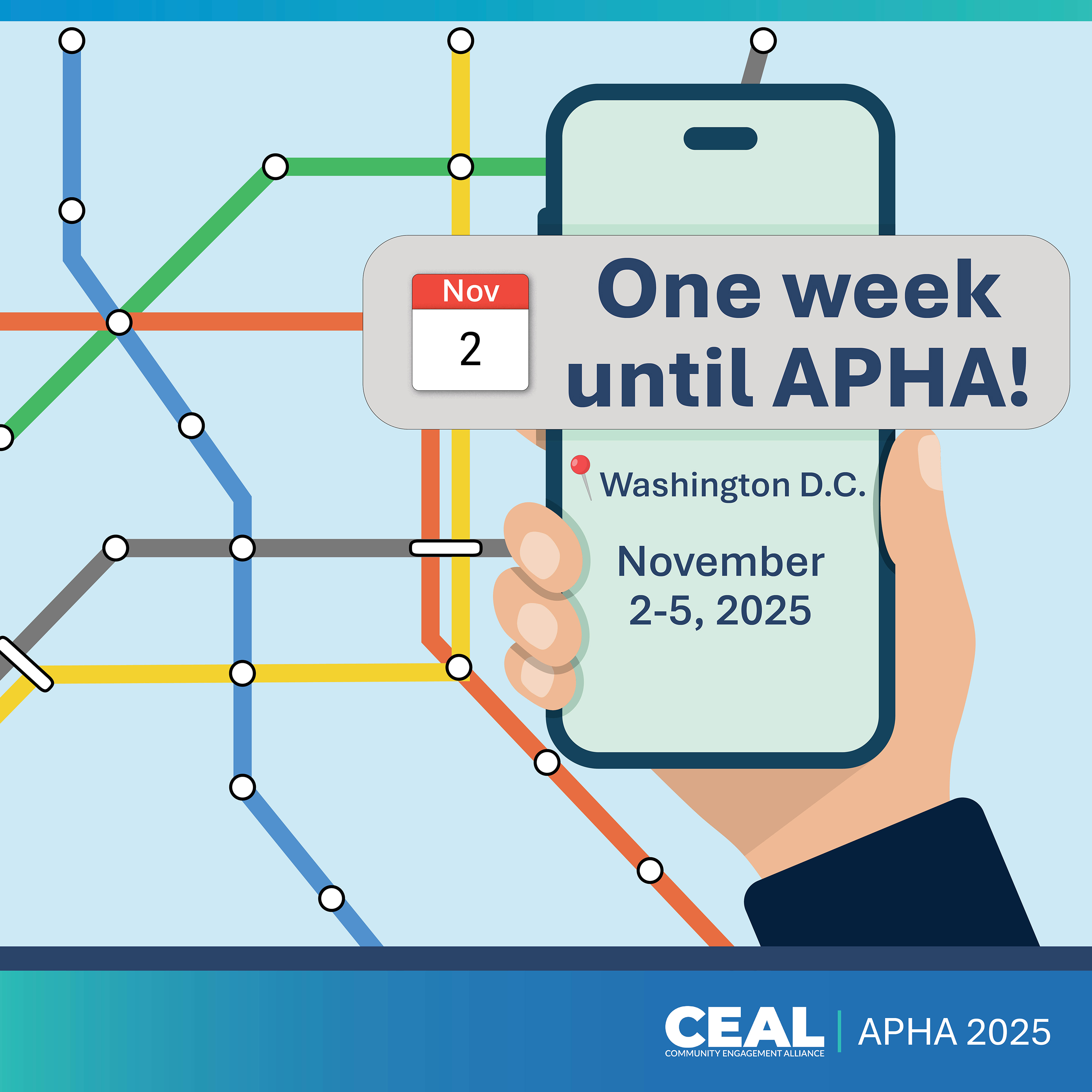 Alt text: An illustration of the Washington, D.C. metro map and a mobile phone with a calendar reminder. Text: One week until APHA! Washington, D.C., November 2-5, 2025.