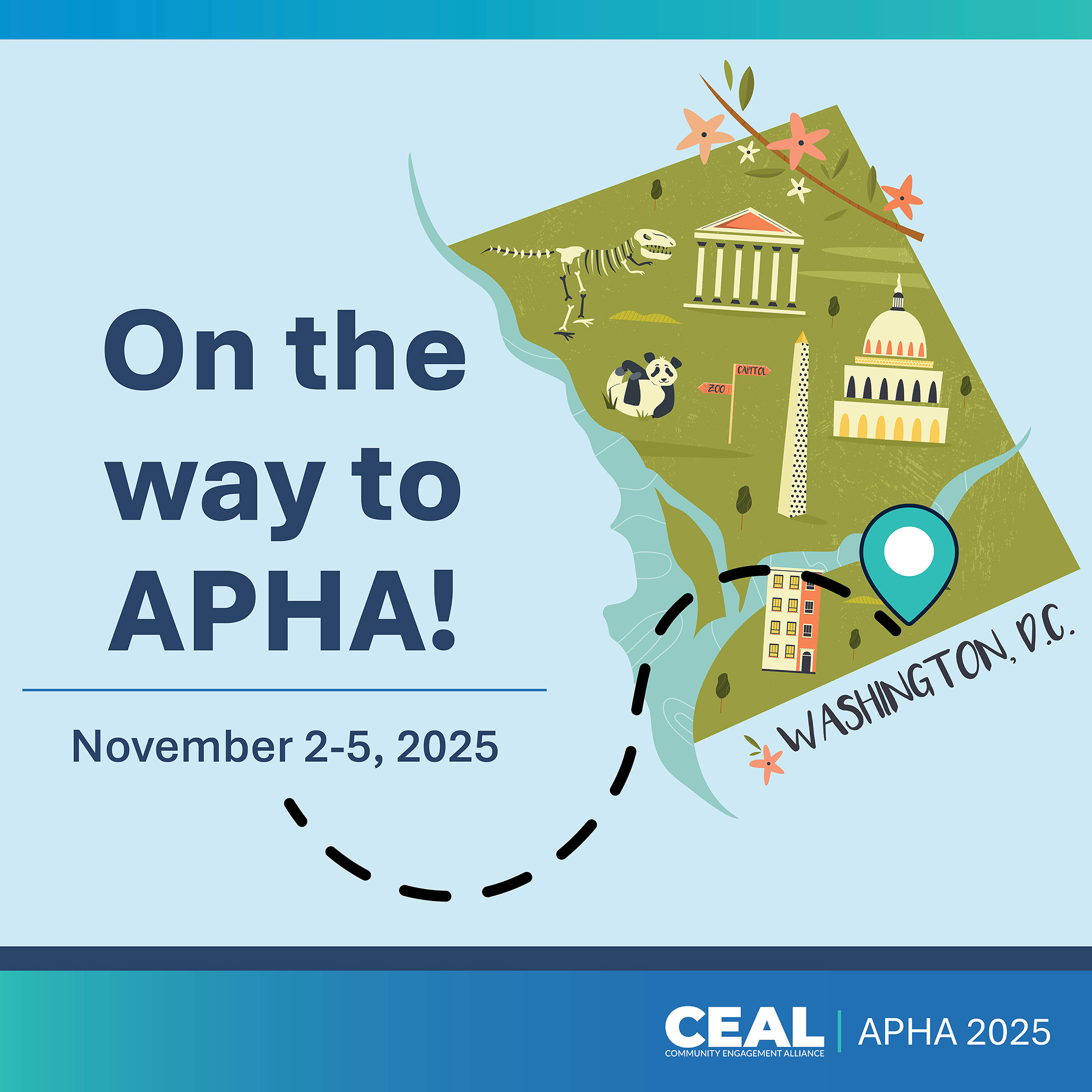 Alt text: An illustration of Washington, D.C., with landmarks, including the National Zoo, Lincoln Memorial, Washington Monument, and U.S. Capitol. Text: On the way to APHA! November 2-5, 2025.